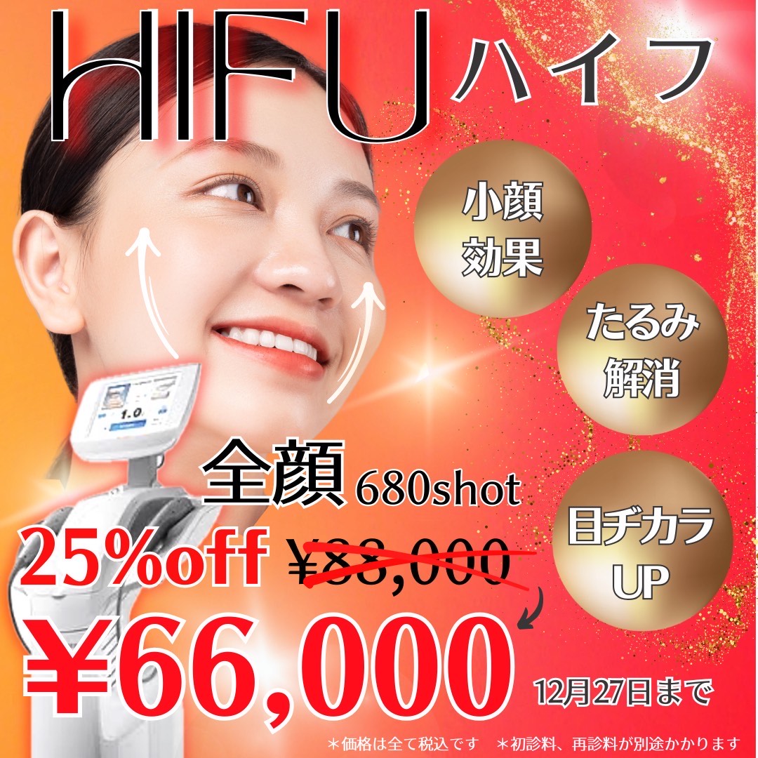 HIFU(通常 88,000円)が 25%オフの 66,000円 にてご案内可能です。